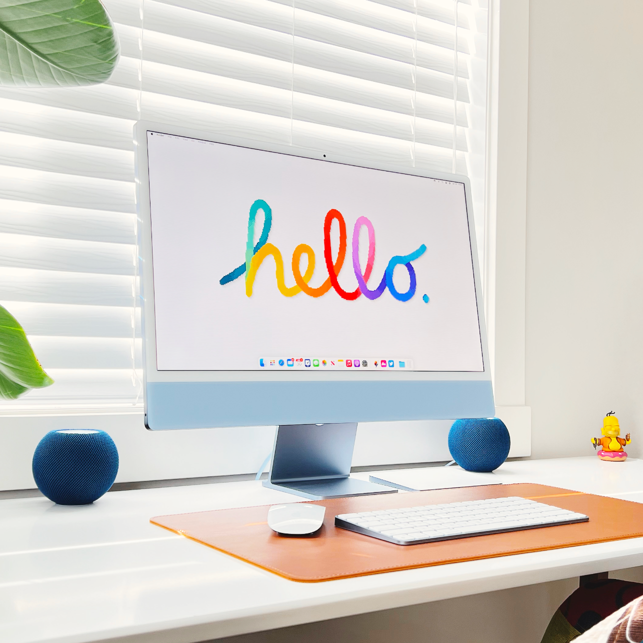 Typical of Apple products, the box starts with colour-matched photos of the iMac inside. The second thing I noticed was the handle on top of the box, which was blue & colour-matched to the iMac inside. Upon opening the box, the accessory kit included a matching Magic Mouse, Keyboard, and Trackpad, all in a beautiful Sky Blue anodized finish. Pause and do the math for a second; Apple has seven different iMac colours, which means it has seven Mouse & Magic Trackpads to produce. Apple also offers three keyboard configurations (Magic Keyboard, Magic Keyboard + TouchID, & Magic Keyboard with Numeric Keypad), creating at least 21 layouts in seven different colours. Keyboards alone mean Apple needed to produce nearly 150 configurations for just one component. From there, you'll come across colour-matched Apple Stickers and matching braided cables for power and a Lightning-to-USB-C cable for charging. Finally, covering the glass on the iMac is a colour-matched sticker printed with 'hello' in Apple’s iconic cursive type. It was extravagant to see the lengths Apple went for this iMac, but it made the whole experience feel exceptionally personalized and made this product genuinely feel like a labour of love.